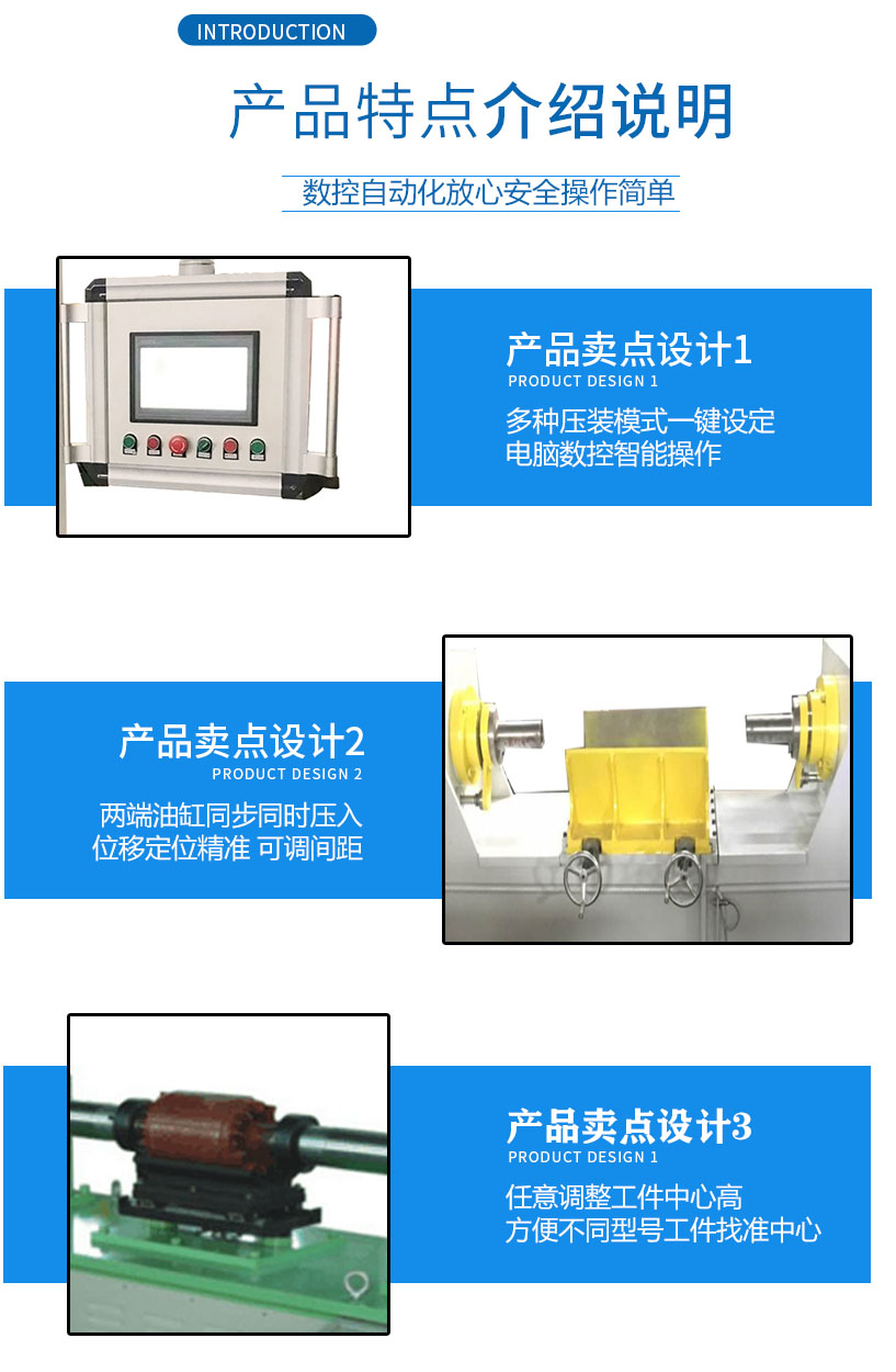 主要用于電機轉子兩端軸承壓入,兩端油缸同步同時(shí)壓入 位移定位精準
